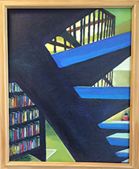 Acrylic paint on canvas by Northport Artist, Emily Eisen, providing a unique perspective of the staircase leading to the mezzanine of the Northport Library building. The artist shared that she is honored and delighted to have her painting hanging in her much-loved library. The piece is located in the Café.