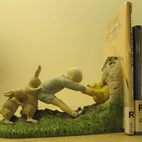 These bookends were donated by Michael Glennon in memory of his wife Connie in December 2000. On display in the Northport Children's Room, they depict Christopher Robin pulling Pooh from Rabbit's house.