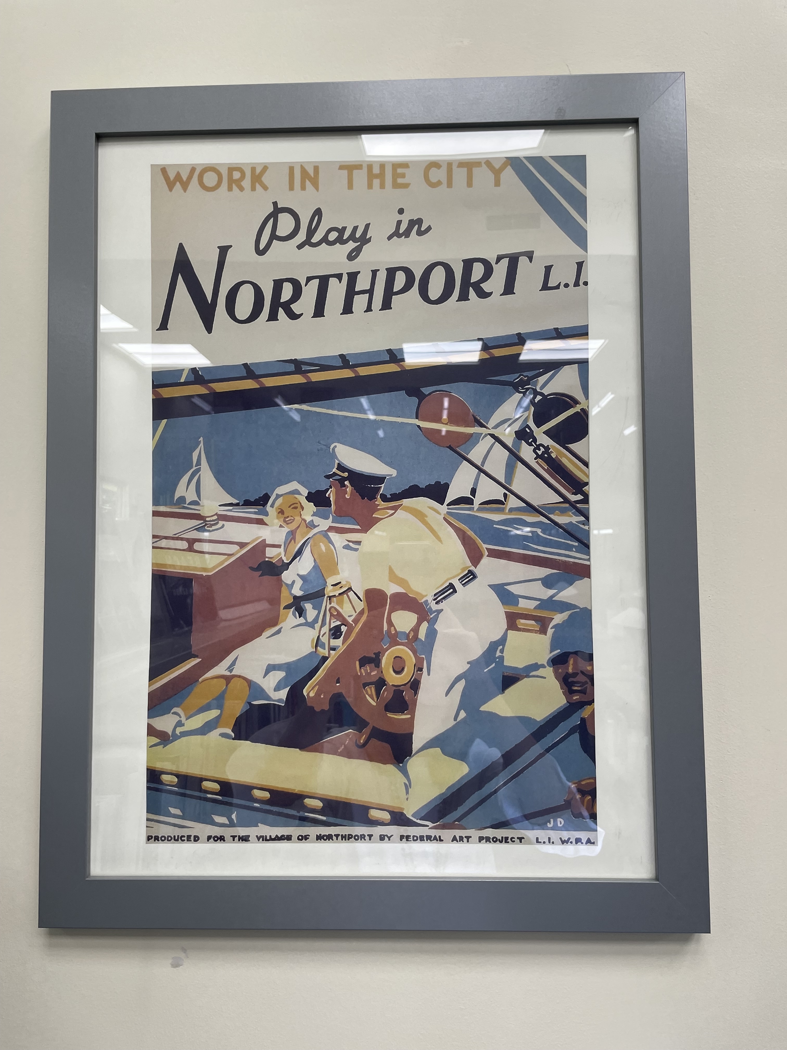 Color print of “Work in the City, Play in Northport, L.I.” located in the local history area of the main reading room. This print was produced for the Village of Northport by the Federal Art Project and was donated to the Library by the Northport Historical Society in 2022.