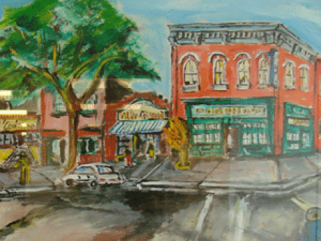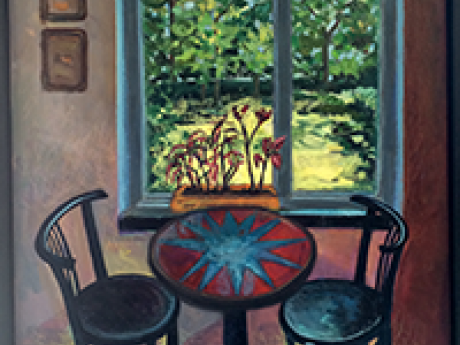 Acrylic paint on canvas by Northport Artist, Emily Eisen, providing a garden view of the Library Courtyard from the Northport Library Café. The artist shared that she is honored and delighted to have her painting hanging in he