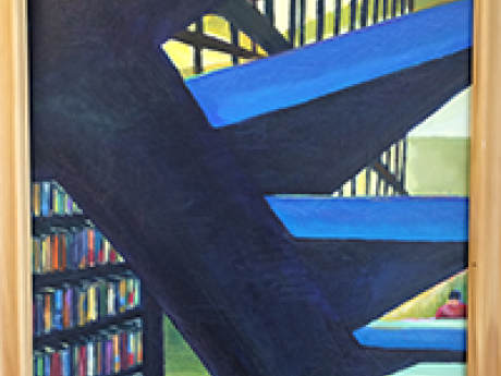 Acrylic paint on canvas by Northport Artist, Emily Eisen, providing a unique perspective of the staircase leading to the mezzanine of the Northport Library building. The artist shared that she is honored and delighted to have