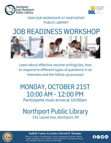 Suffolk County Labor Specialist Alonzo Cook will provide resume writing, interviewing, and etiquette assistance along with an overview of the services the Suffolk County Department of Labor offers. Bring your resume and questions. Mock interviews will be conducted if time permits.