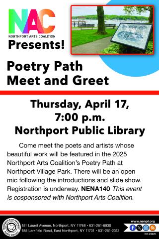 Come meet the poets and artists whose beautiful work will be featured in the 2025 Northport Arts Coalition's Poetry Path at Northport Village Park. There will be an open mic following the introductions and slide show. Registration is underway. This event is cosponsored with Northport Arts Coalition.