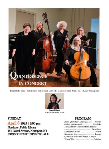 Enjoy an afternoon of strings and piano highlighting works by Mozart, Gershwin, Saint-Saens, and more. QuintEssence features Laura Mole (violin), Jody Ratner (viola), Susan Lehr (cello), Karen Gellert (double bass), Elinor Zayas (piano), and special guest Hiroko Nakahara (violin). Registration is underway.