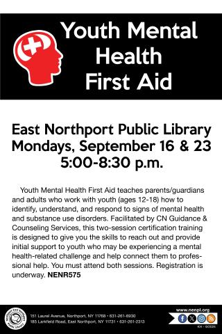 Youth Mental Health First Aid teaches parents/guardians and adults who work with youth (ages 12-18) how to identify, understand, and respond to signs of mental health and substance use disorders. Facilitated by CN Guidance & Counseling Services, this two-session certification training is designed to give you the skills to reach out and provide initial support to youth who may be experiencing a mental health-related challenge, and help connect them to professional help. You must attend both sessions.
